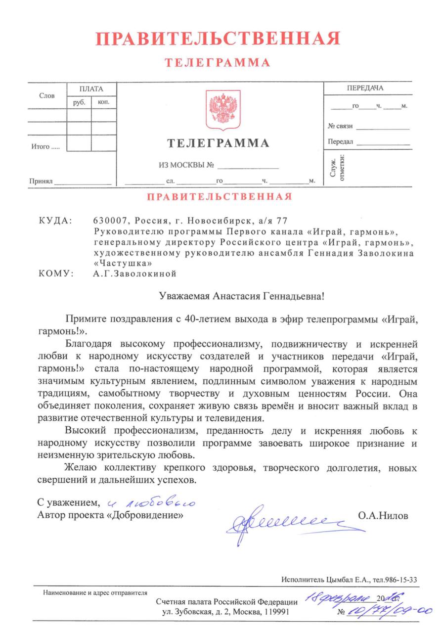 Поздравляем коллектив телепрограммы «Играй, гармонь!», её ведущих, музыкантов и всех преданных зрителей с 40-летним юбилеем! Пусть гармонь и дальше звучит широко и звонко, наполняя сердца радостью, теплом и любовью к родной культуре.